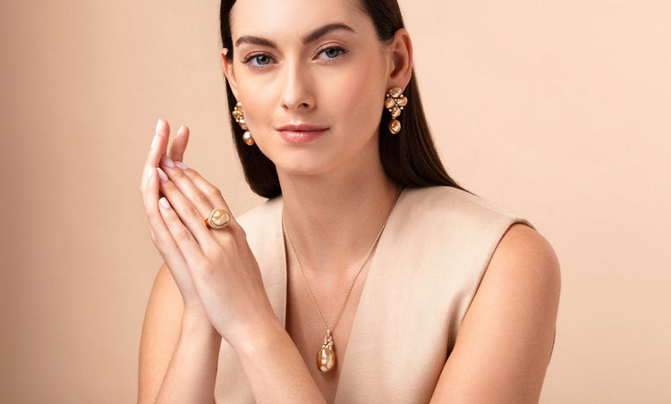 Dive into our ocean-inspired collection, celebrating the mesmerising beauty of baroque pearls in deep blues and golden hues. Each piece is a unique treasure, showcasing the allure of organic shapes and intricate diamond-encrusted settings. Experience the enchanting wonders of the sea with every wear.